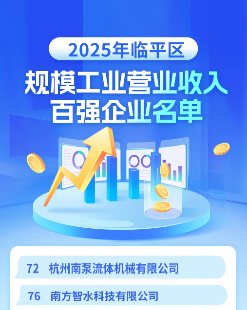 近日,临平统计调查发布《2025年临平区规模工业营业收入百强企业名单》,南方泵业智造事业部旗下杭州南泵、南方智水2家子公司光荣上榜。
