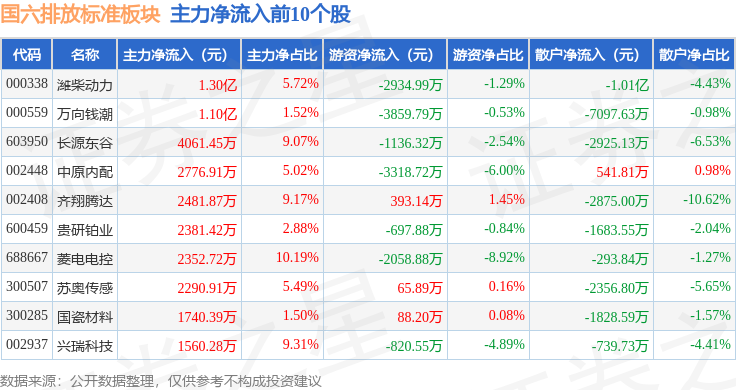 从资金流向上来看,当日国六排放标准板块主力资金净流出3666.56万元,游资资金净流出8337.17万元,散户资金净流入1.2亿元。国六排放标准板块个股资金流向见下表: