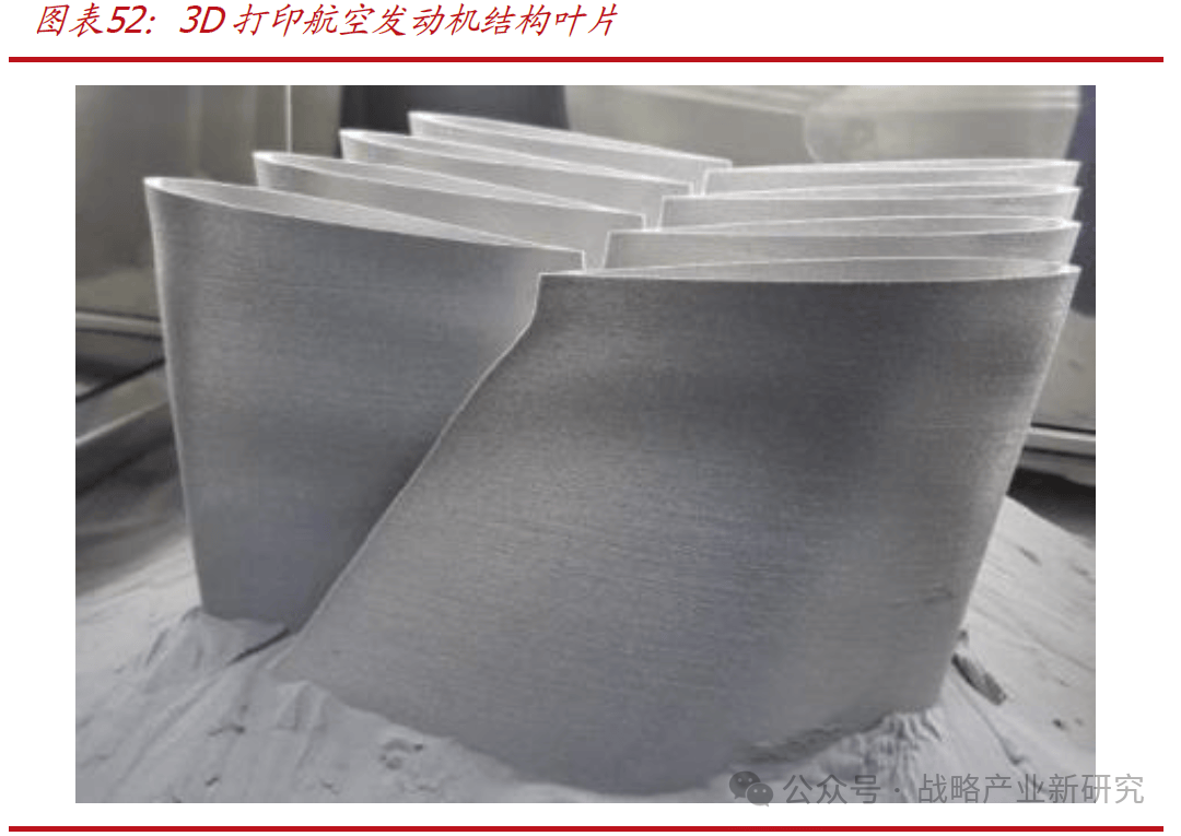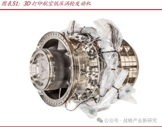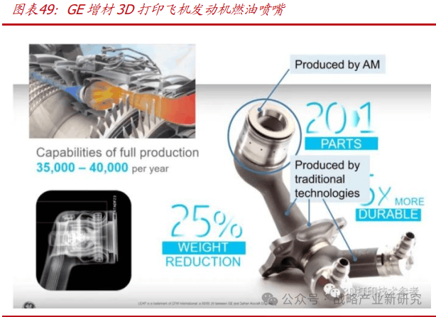 截至 2021 年, 美国GE增材已经打印了超过 10 万个航空发动机燃油喷嘴,并实际应用于其最先进的“LEAP 发动机”中,空客 A320 NEO、波音 737 MAX和中国国产 C919 大型客机都采用了 Leap 引擎。传统的燃油喷嘴由 20 个单独的部件焊接而成,采用 SLM 3D 打印技术,整套喷嘴可以一次成形,无需后续焊接,零件数量降为 3 个。改进后的燃油喷嘴具有质量轻、强度大和耐腐蚀的特性,可在高达近千摄氏度的环境下正常工作,重量减少 25%,使用寿命提升至 5 倍,燃油效率也得到极大的提升;