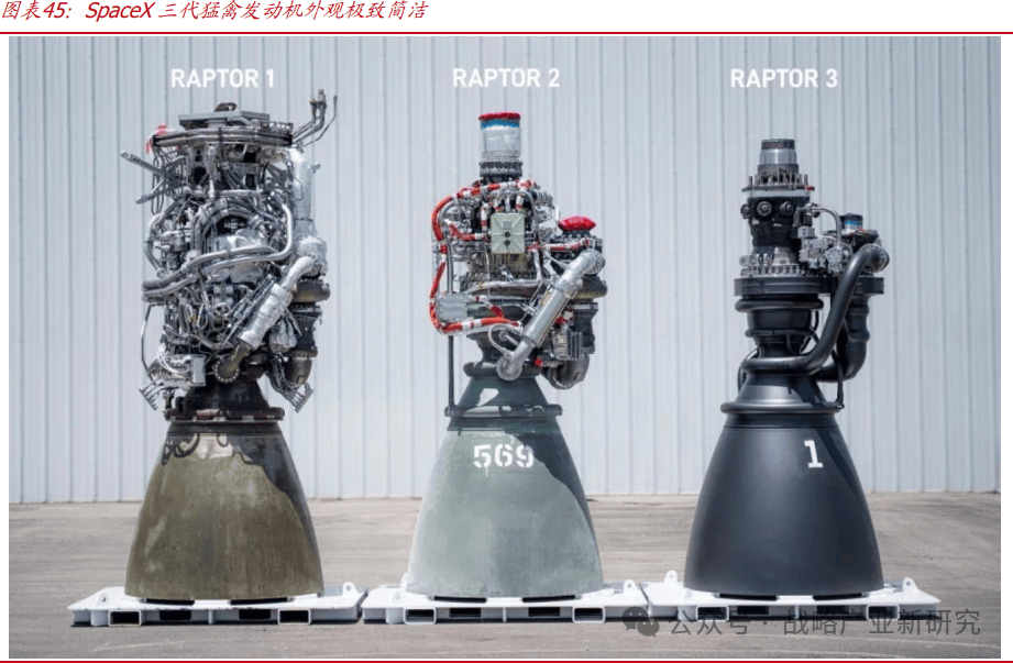 三代猛禽发动机【Raptor 3】:从外观设计上看,前两代错综凌乱的管线消失不见,取而代之的是几根管径粗大、整齐布列的排线,发动机整体造型十分简洁。第三代猛禽通过 3D 打印工艺,将前两代的多零部件整合为一,其设计上采用了整体的冷却通道壁,还将某些次级管路集成到主涡轮泵中,大幅简化了发动机的结构,使得发动机零部件的管端连接、线路连接以及各类螺丝垫片大幅减少,同时取消了发动机的隔热罩,整个发动机重量骤降 100 多公斤达到 1525 公斤,而且还减少了潜在的故障点,提高了发动机的可靠性。先进金属 3D 打印工艺的使用使得 Raptor 3减重 7%,推力相较于 Raptor 2 高出了 21%。