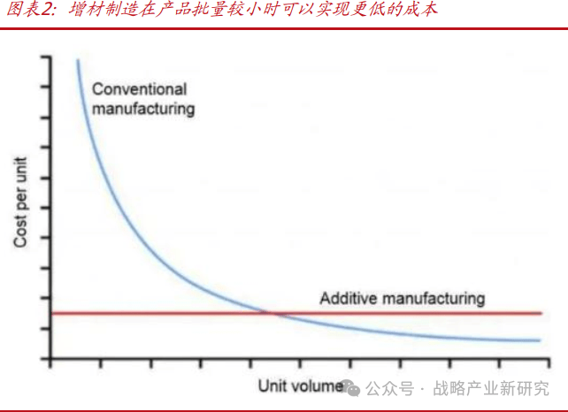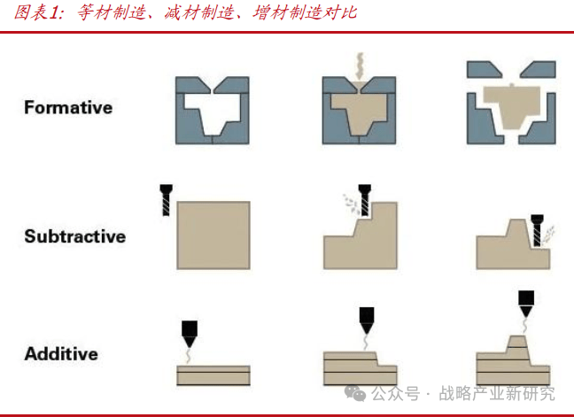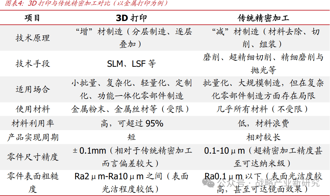 此外,传统制造经常需要切削掉大量材料,因此加工成本高,材料利用率低。与传统的“减材”制造方法相反,3D 打印制造技术是“增材”,以计算机三维数字模型为基础,利用激光等高能热源将原料以分层叠加的方式逐层熔化、堆积,最终得到目标实体。