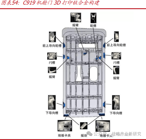 国产大飞机机身多处采用 3D 打印材料。在我国国产大飞机 C919 的制造过程中,有多个关键部件都采用了 3D 打印技术进行生产。援引北京航空航天大学王华明院士(负责C919 机头钛合金 3D 打印主风挡整体窗框)观点:(“3D 打印会改变未来装备的结构,也许会改变未来装备性能,也许一个飞机需要 3 万个零件,自重好几十吨,现在有了 3D打印之后,几万个零件变成 2000 个零件,数量已经大幅度减少”。目前 3D 打印在 C919发动机喷油嘴、机头钛合金主风挡整体窗框、中央翼缘条、舱门复杂件等领域均有应用: