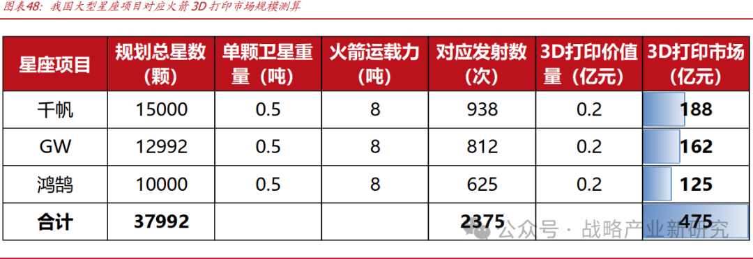 航天 3D 打印市场规模测算,3 大星座项目对应 2000 余次发射,带来 475 亿元 3D 打印累积市场规模。我们对 3D 航天打印市场规模进行测算:目前我国有 3 个大型星座项目,分别为千帆、GW、鸿鹄,规划卫星数量分别为 1.5、1.3、1 万颗,假设单颗卫星重量 0.5 吨,单枚火箭运载能力 8 吨,则需要 2375 次发射才能满足 3 大星座项目对应的总卫星并轨需求。假设单枚火箭发动机 3D 打印价值量为 2000 万元,在不考虑发动机重复使用的情况下,则我国航天 3D 打印市场规模有望累积达 475 亿元。
