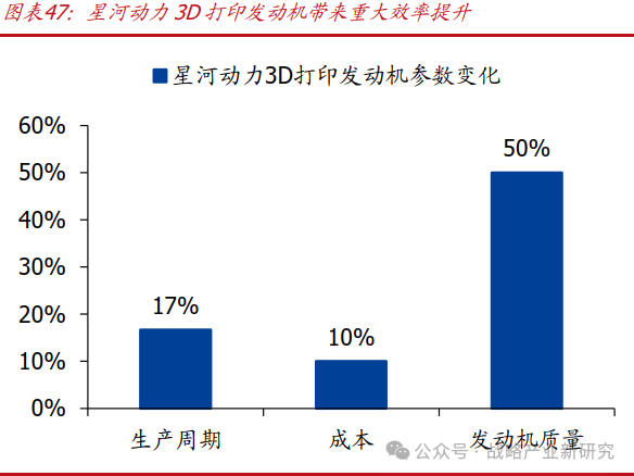 智神星二号CQ-90发动机上,90%以上重量采用3D打印技术制造。3D打印工艺发动机生产周期缩短至1个月内,为传统模式的1/6,制造成本降至原来的10%,同时发动机重量减轻50%,显著提升了运载效率和经济性。一台2500N火箭发动机核心零件的制造成本,从传统工艺的50万元降至3D打印技术的不到5万元。星河动力在其苍穹50吨级液氧煤油发动机中,涡轮泵3D打印件重量占比约65%,发生器3D打印件重量占比约75%,主管路90%为3D打印件,推力室3D打印部分占比约30%,阀门壳体类零件约90%为3D打印制造。铂力特2024年商业航天领域订单中,星河动力占比超30%。2019年,飞而康科技与星河动力合作,利用华曙高科金属3D打印解决方案,在4个月内完成30多件火箭发动机零件的交付;